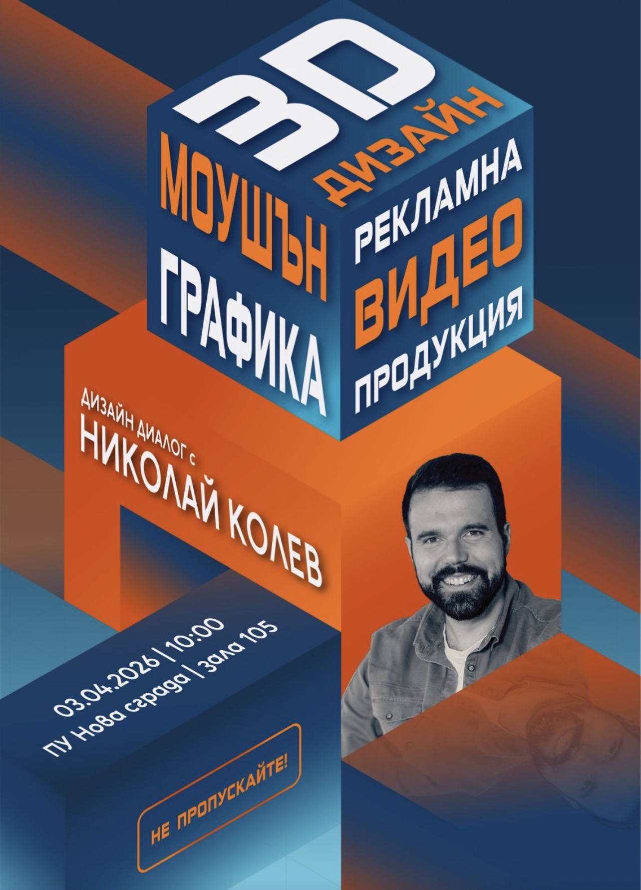 Заповядайте на следващото издание на ДИЗАЙН ДИАЛОГ. Гостува ни Николай Колев, специалист в областта на 3D дизайна, моушън графиката и рекламната видеопродукция.