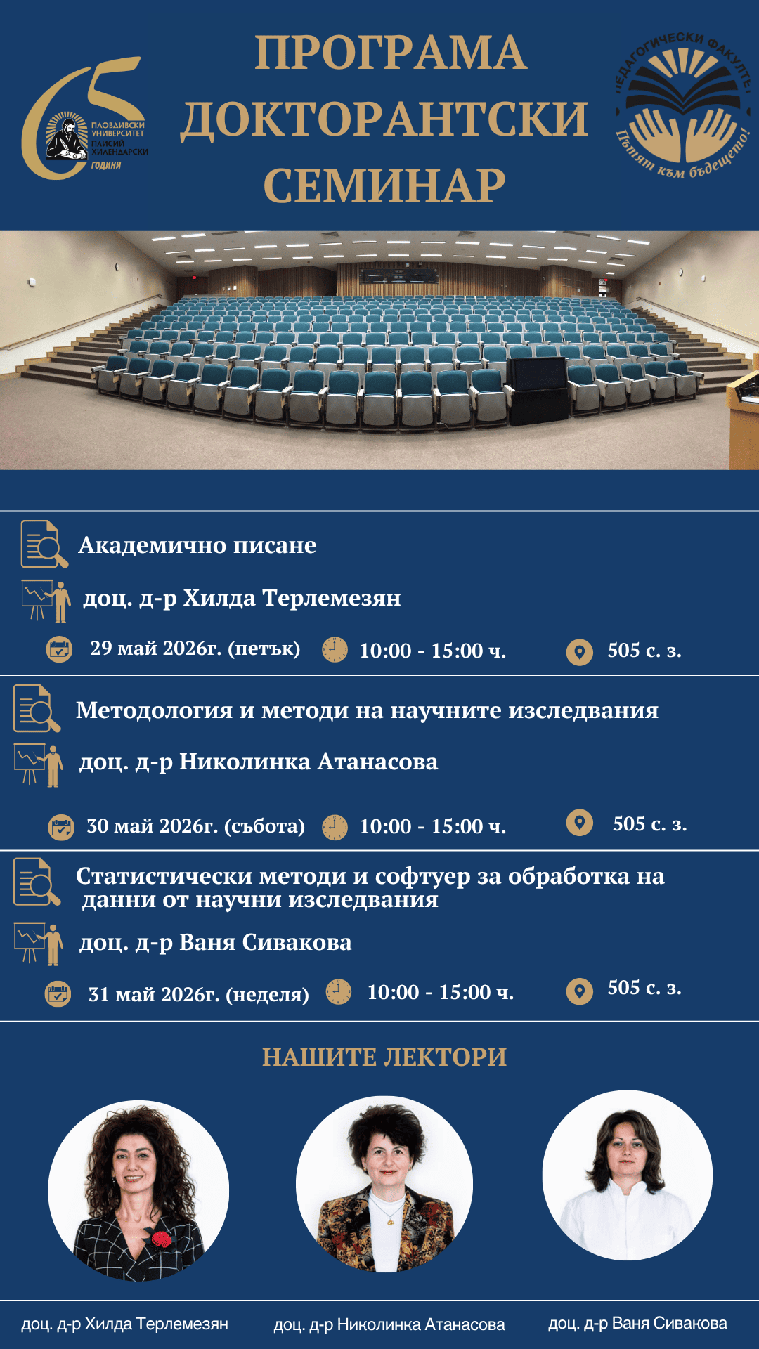 Деканското ръководство на Педагогическия факултет Ви кани на тридневен докторантски семинар. Темите, включени в семинара ще Ви подготвят за изпитите от Блок А, заложени в рамковия учебен план за първата година от Вашето обучение.