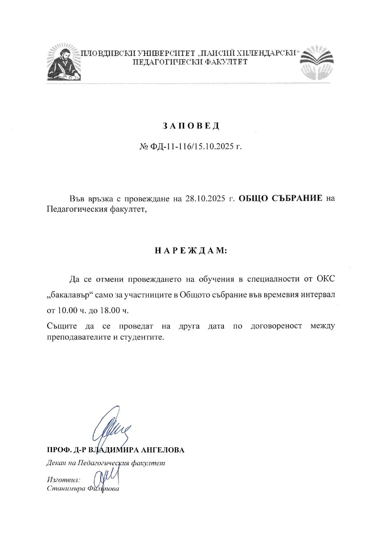 Заповед във връзка с провеждане на Общо събрание на Педагогически факултет