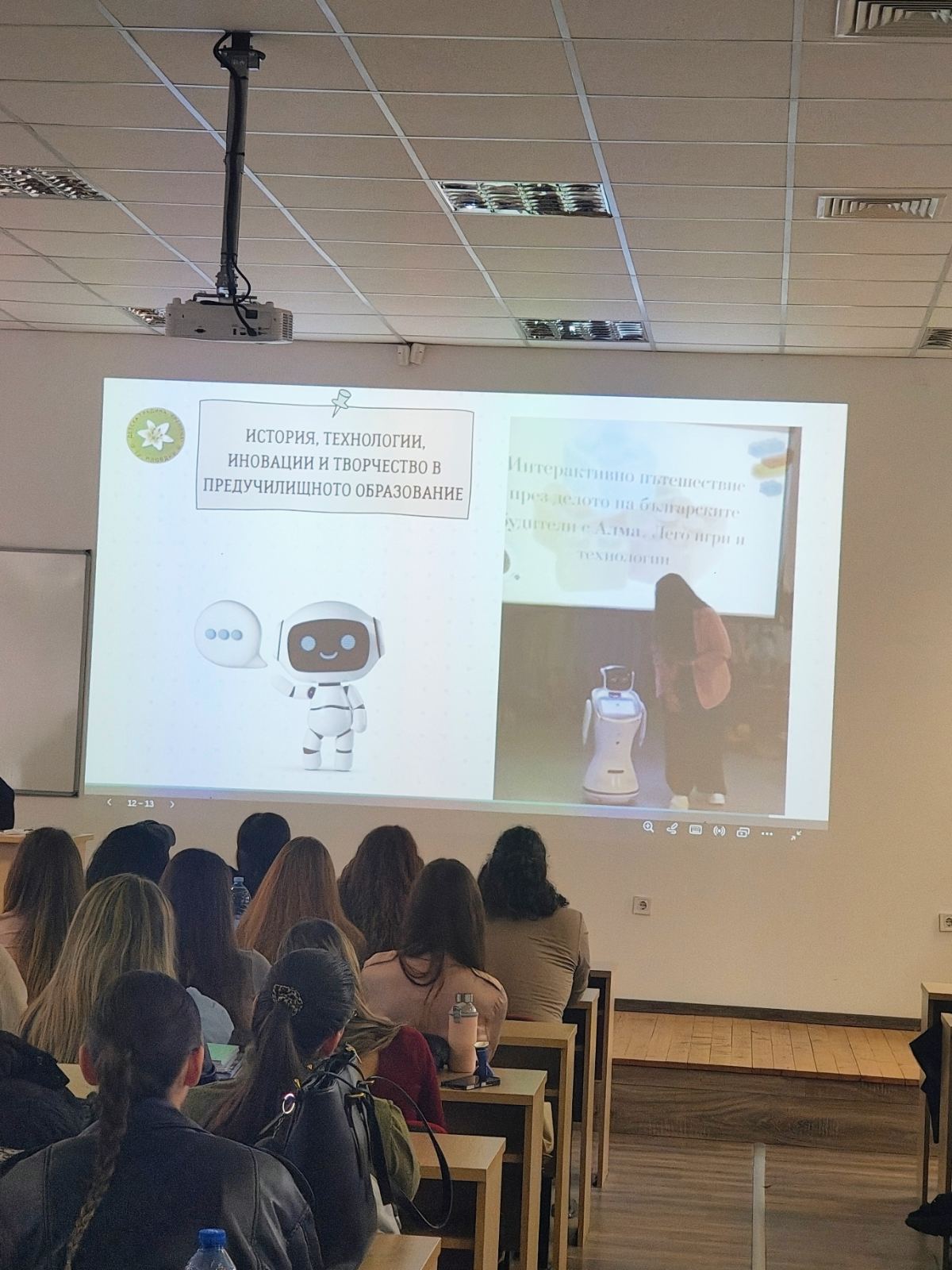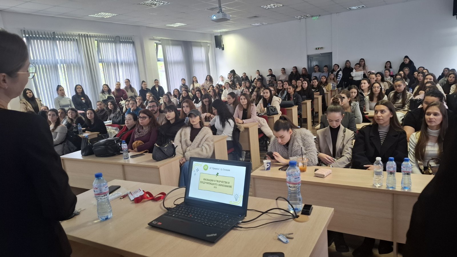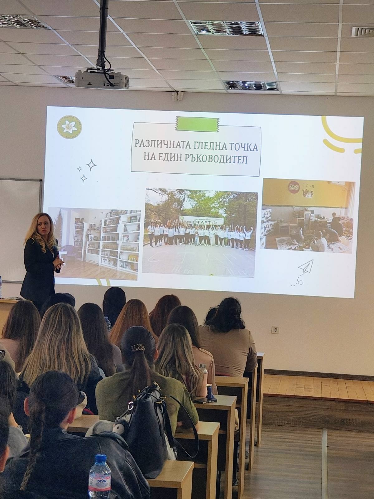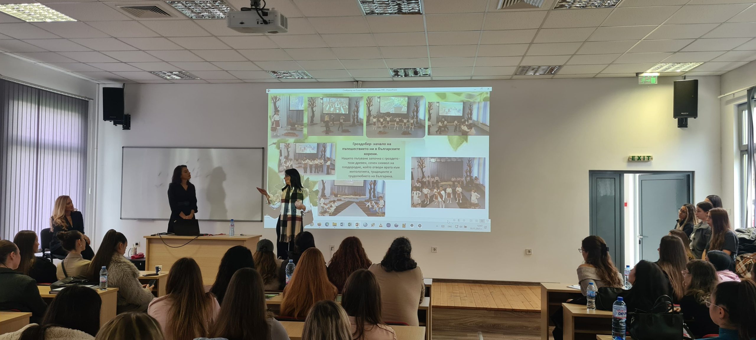 На 19 ноември Клуб „Млад педагог“  съвместно с катедра Предучилищна педагогика организираха вълнуваща среща на тема „Съвременни педагогически практики, в духа на иновациите и творчеството в предучилищното образование. Лектори на събитието бяха екип на детска градина  „Кремена“, г-жа Борислава Вичева – директор на детската градина, заедно с г-жа Румяна Марудова и г-жа Илияна Стоилова.