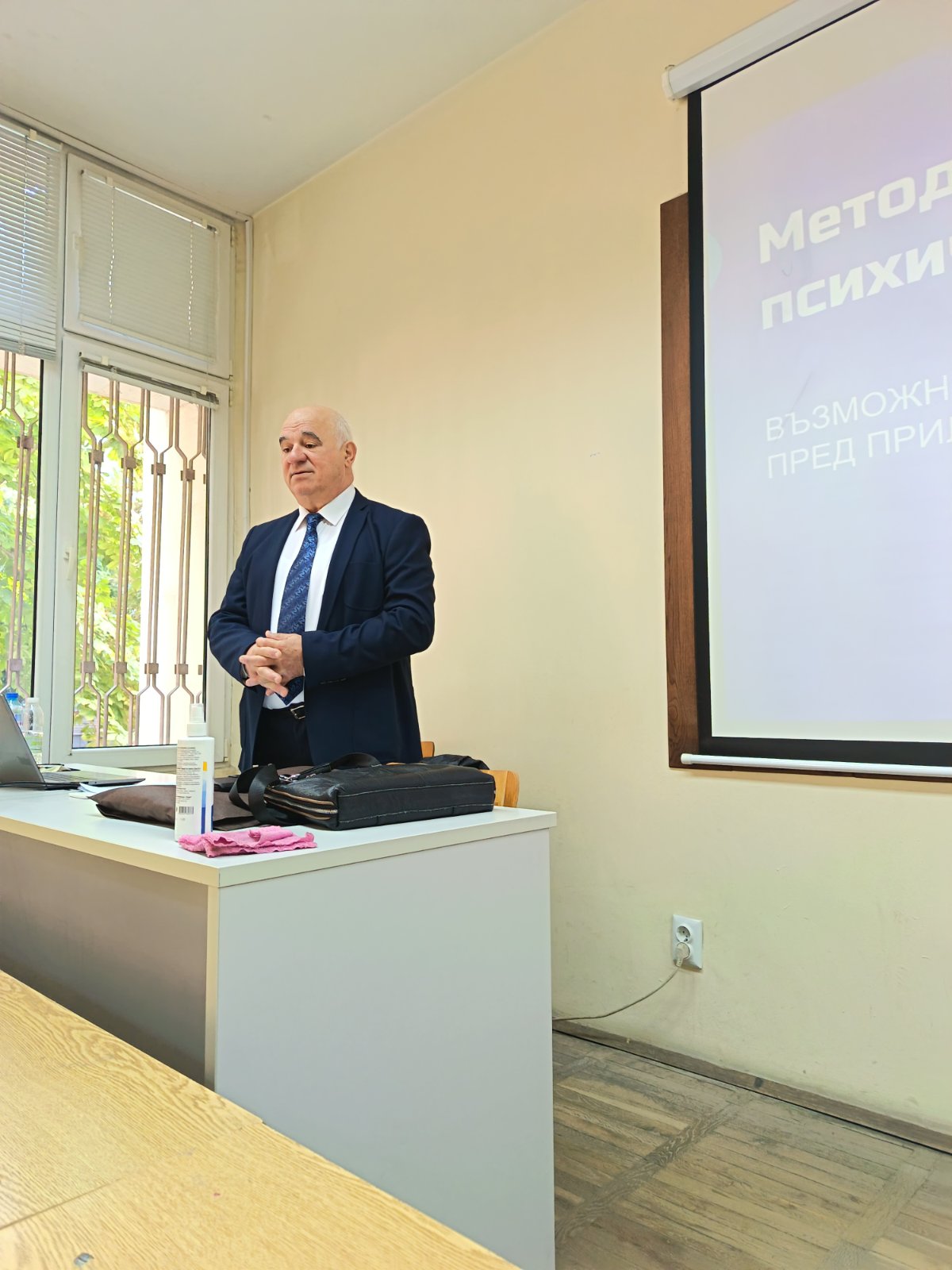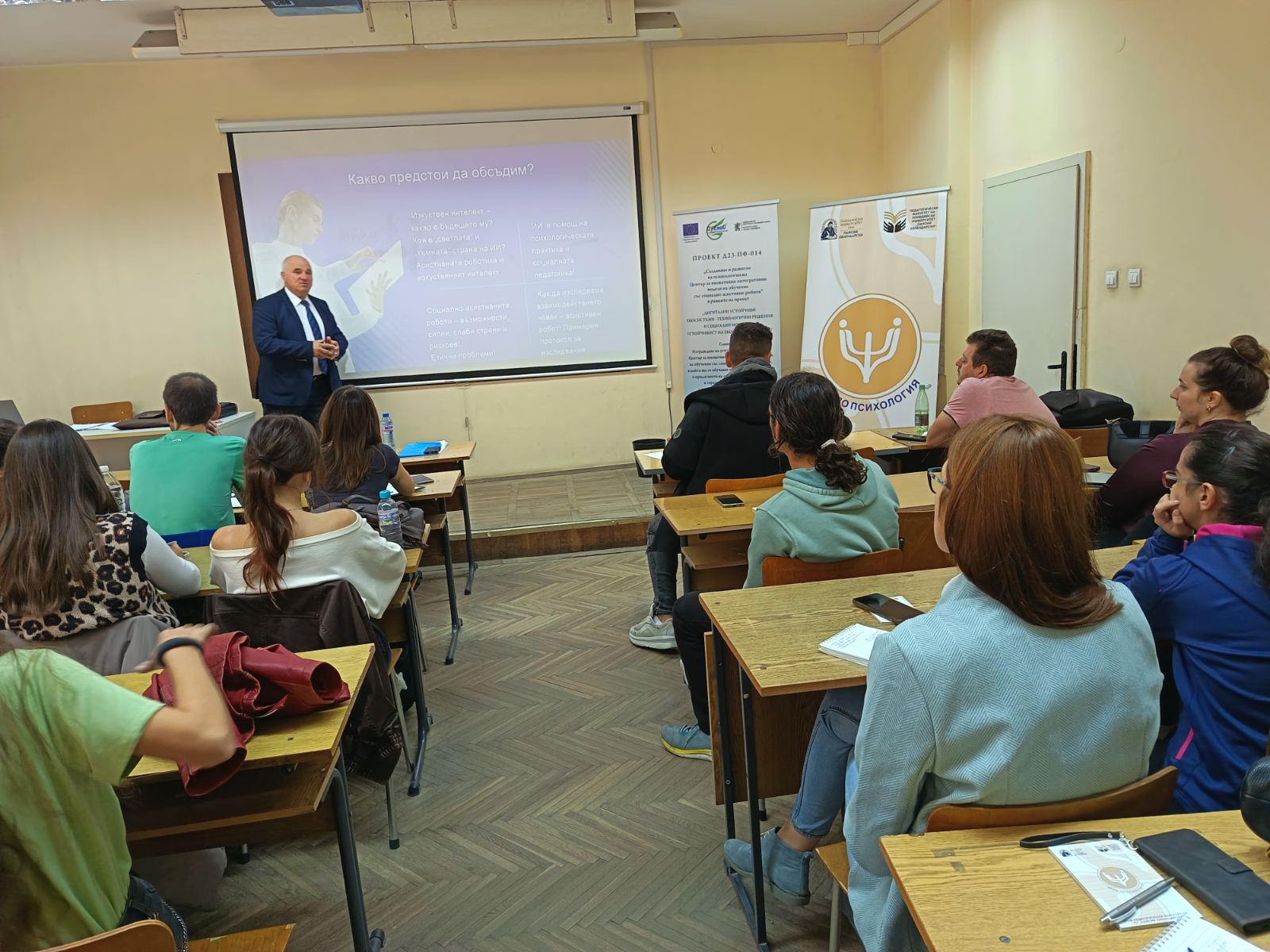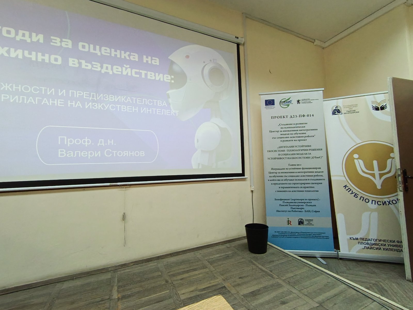 На 15.10.2025 г. бе проведено обучение от проф. д.н. Валери Стоянов в рамките на дейността на Клуба по психология и проекта Дуекос BG-RRP-2.004-0001-C01 Д 23 ПФ-014, Създаване и развитие на Център за психологически Център за иновативни интегративни модели на обучение със социално-асистивни роботи“ – RoboPsy с ръководител проф. дпн Майяна Митевска