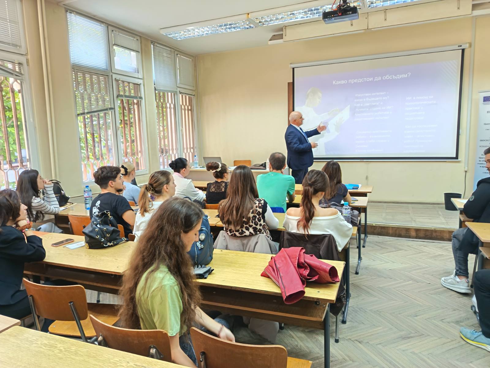 Проф. Стоянов представи основните концепции на ИИ – от дефиницията и практическите приложения (в здравеопазване, образование, социална работа) до обсъждането на неговите „светла“ и „тъмна“ страни, свързани с етични дилеми, рискове от пристрастия и потенциална зависимост от технологии.
