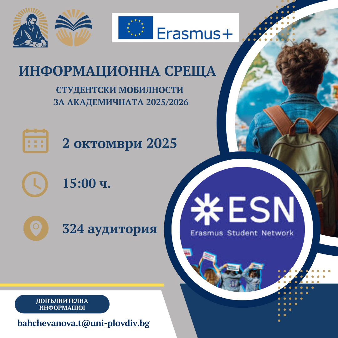 Деканското ръководство на Педагогическия факултет има удоволствието да Ви покани на информационна среща, посветена на възможностите за студентска мобилност по програма Еразъм+.