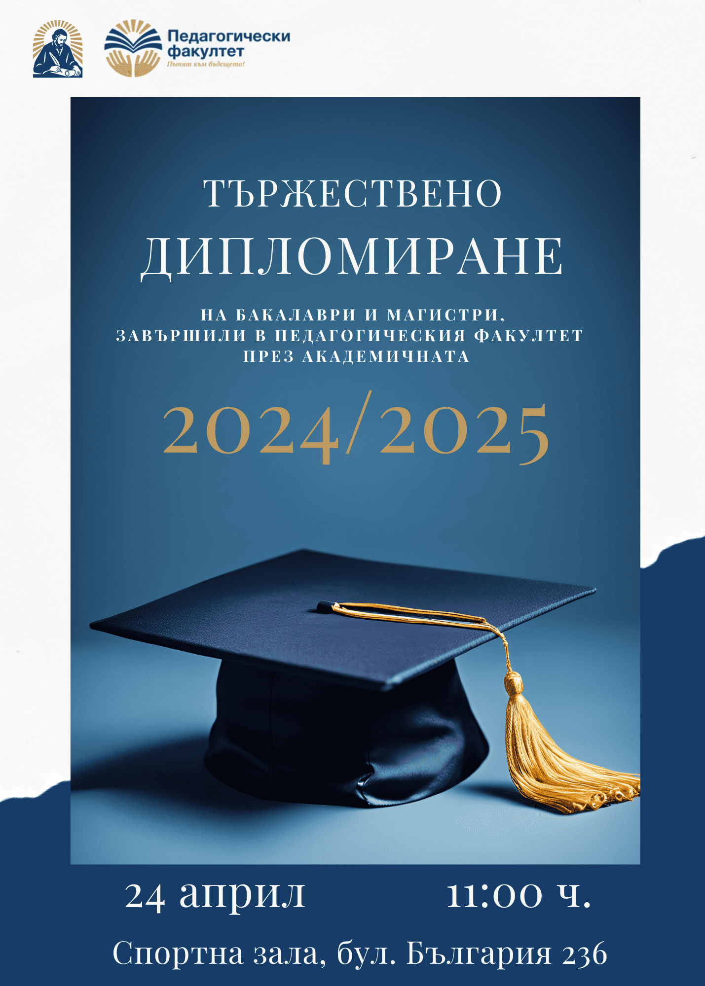 Деканското ръководство има удоволствието да Ви покани на тържествената промоция на завършилите бакалавърски и магистърски специалности от випуск 2024–2025 на Педагогическия факултет.